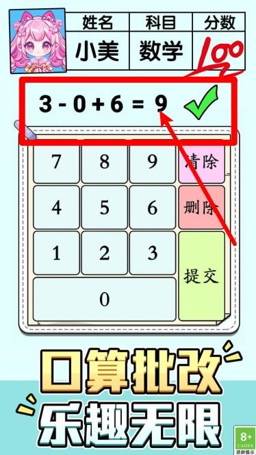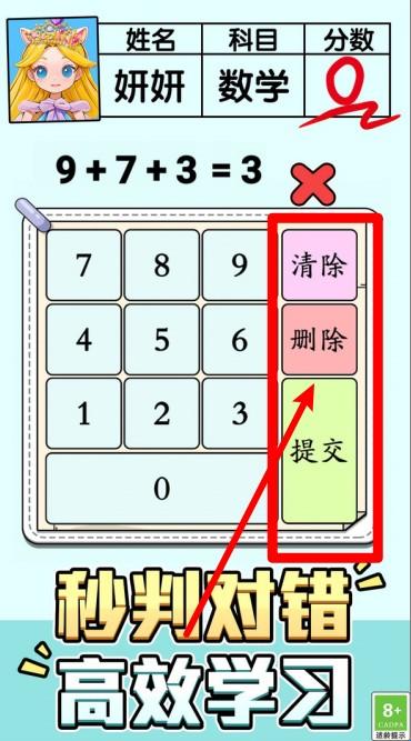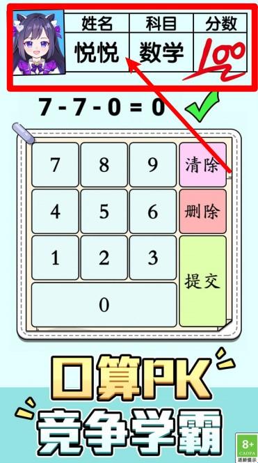 2.姓名科目成绩展示:界面上方清楚显示角色姓名、科目与当前分数,让每一题作答都更有目标与成就感。
