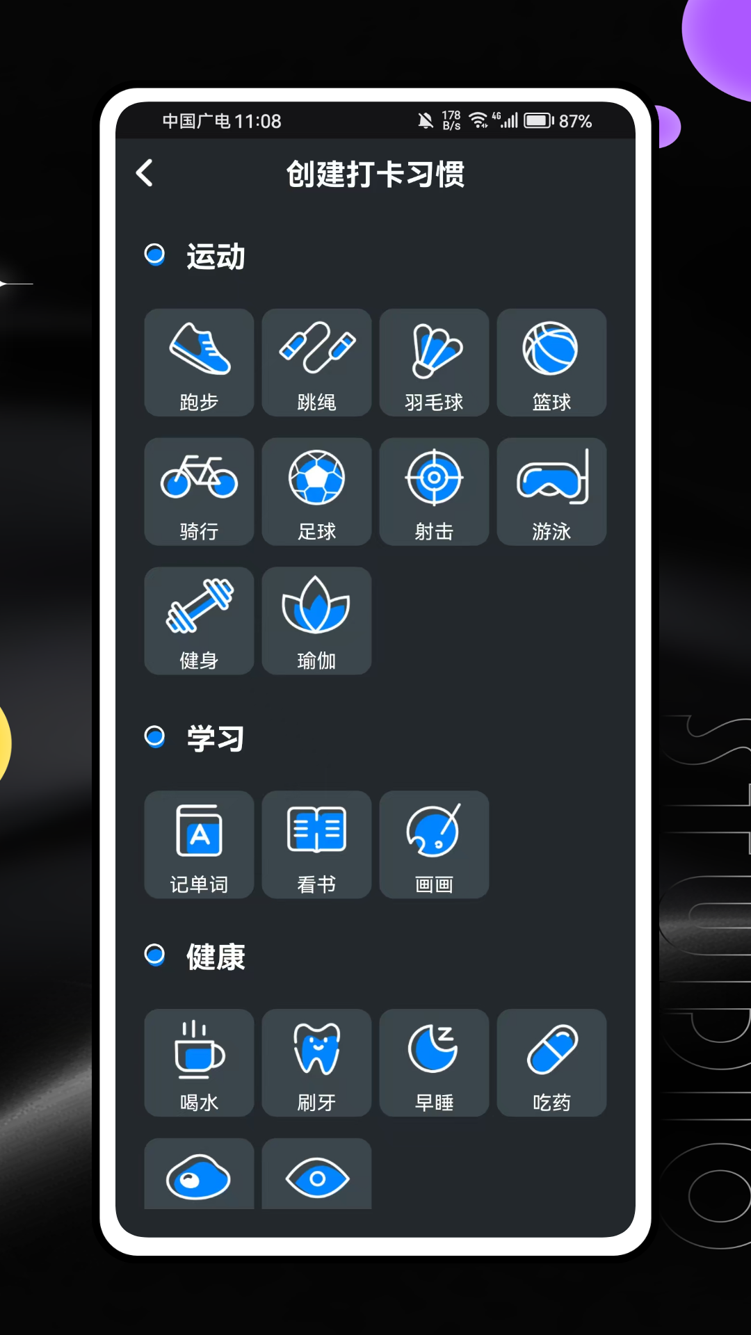 设立任何想要培养的习惯,之后会在对应的时间提醒,来驱动你持续行动。