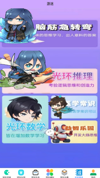 4、来到软件游迷页面可使用脑筋急转弯、光环推理、光环数学等功能。