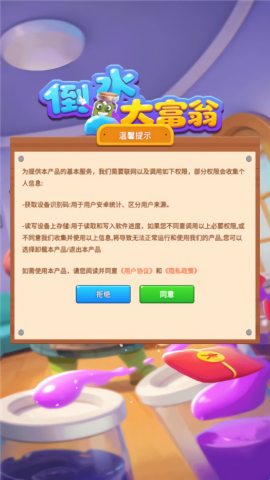 倒水大富翁是一款休闲闯关类游戏,游戏采用可爱的卡通风格设计,游戏玩法简单易上手,游戏会给你很多颜色的液体和一个空瓶子,借助空瓶子将所有相同液体倒入同一个瓶子中即可。想要一路通关非常考验玩家的策略,提前规划好下一个液体倒在哪个瓶子,当然在走投无路时还有道具帮助你,感兴趣的玩家快来体验吧!