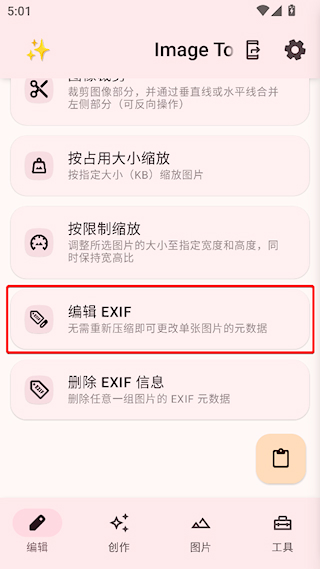 1、在编辑界面往下滚动,找到编辑EXIF功能,点击进入