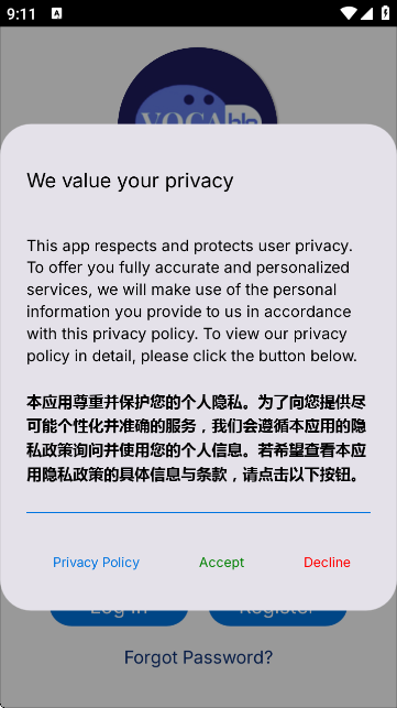 2、首先请阅读并同意用户协议和隐私政策;点击【accept】;