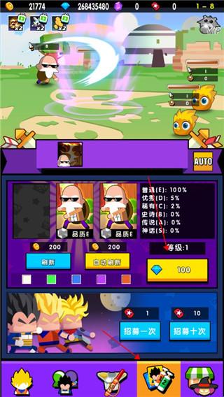 1、在游戏中,增加战斗力最好的方法就是增加游戏角色,点击箭头位置可以给卡池升级,卡池等级越高,出现高品质角色卡牌的几率就越高,点击左边场上没有的角色卡牌即可让他上场。