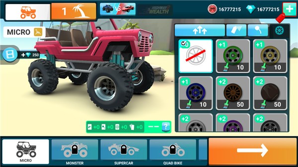 1、进入游戏后我们可以点击右侧升级来给车辆进行性能提升;