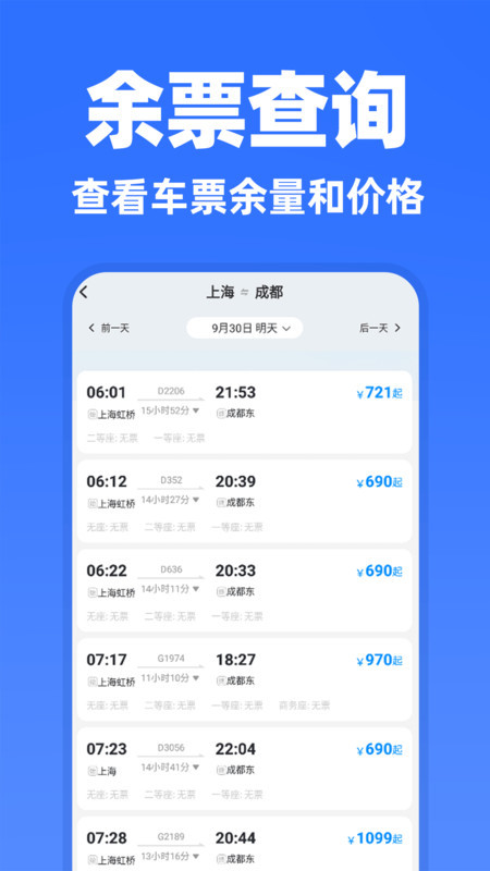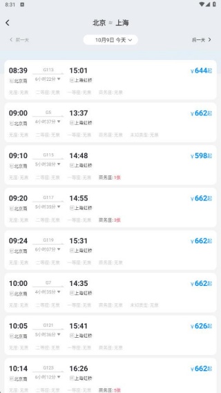 2、车次信息一目了然,不同车次的出发时间、到达时间、经停站点等信息清晰呈现,方便您快速对比选择。