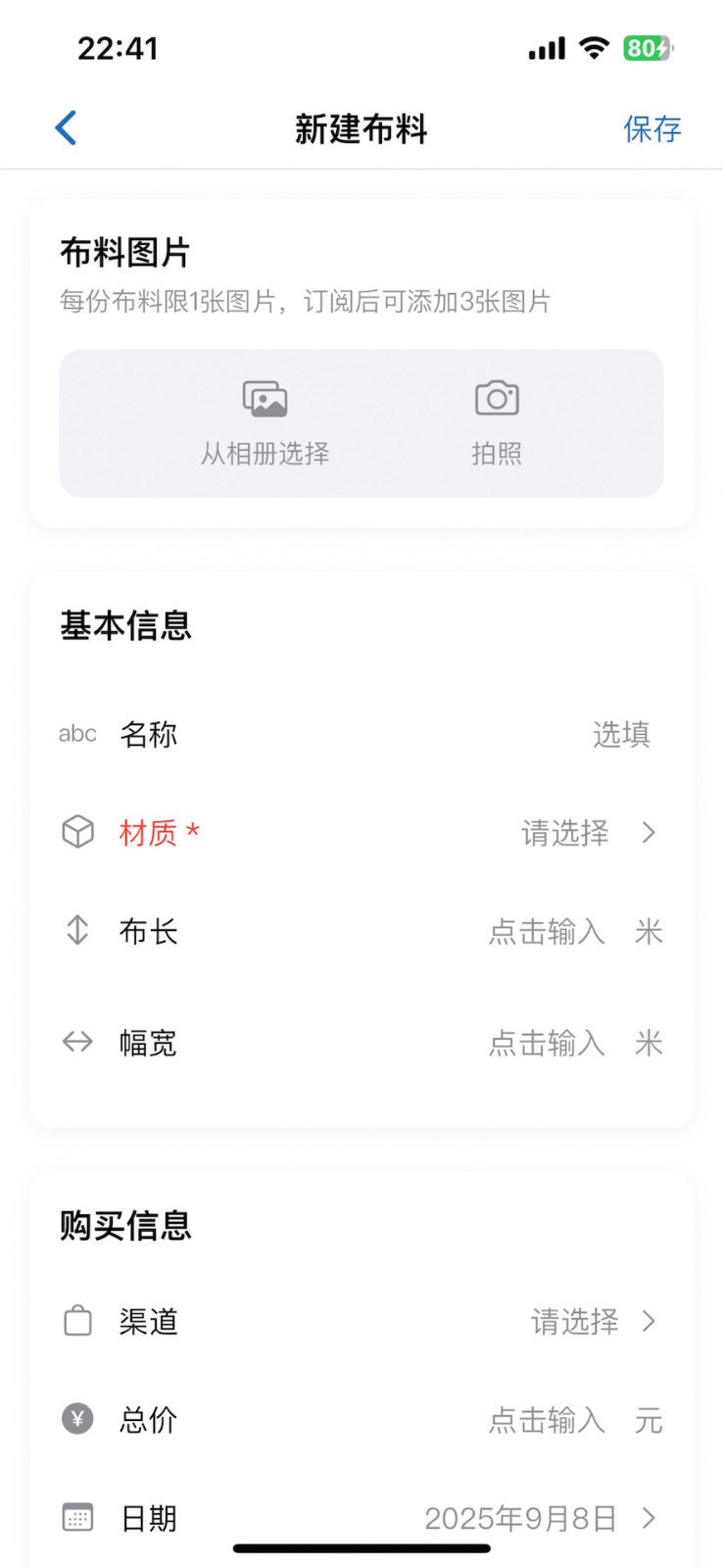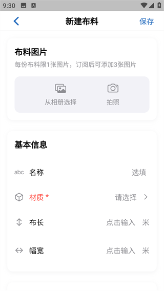 3、点击右下角的加号,可以添加布料的详细信息,然后点击右上角保存;