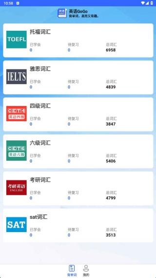 英语GoGo是一款高效又有趣的背单词软件。软件内拥有多种词库,涵盖托福、雅思、四六级等等,适合各种考试和学习需求。提供海量单词卡片,并且释义和例句,同时包含单词发音与例句发音,让用户记背单词更加容易轻松。题型丰富的复习训练让记背单词更加牢固!