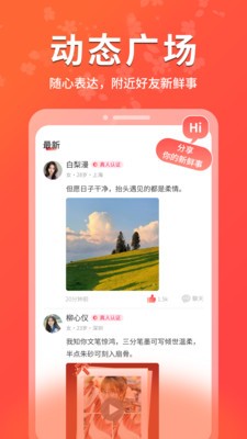 2、动态广场:24小时为你展示当前在线的TA,即时沟通彼此