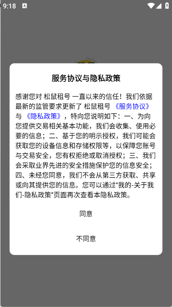 1、首先在本站下载松鼠租号app,查看并同意隐私政策与用户协议。