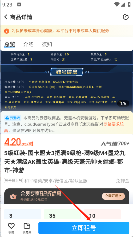 4、玩家点开需要的游戏账号以后,点击“立即租号”即可。