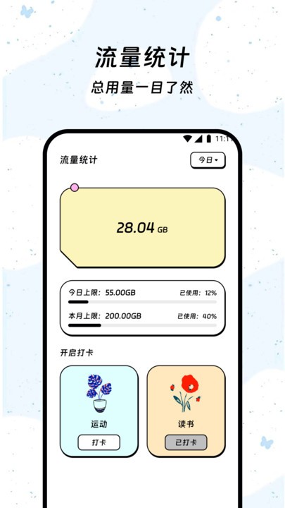 流量解码精灵是一款设计简洁操作简单的流量查询软件。软件内能够帮助用户轻松追踪流量使用实时动态,并且以各种直观地视图让用户可以一目了然流量使用情况。软件内还能进行阅读打卡和运动打卡,辅助用户更加自律。还能在软件内写各种日常生活小记哦!