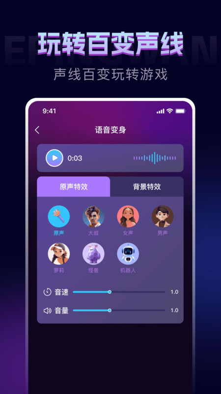 1、一键切换声线,无需复杂设置,秒速变身,为追求便捷的你省时省力,畅享变声乐趣。