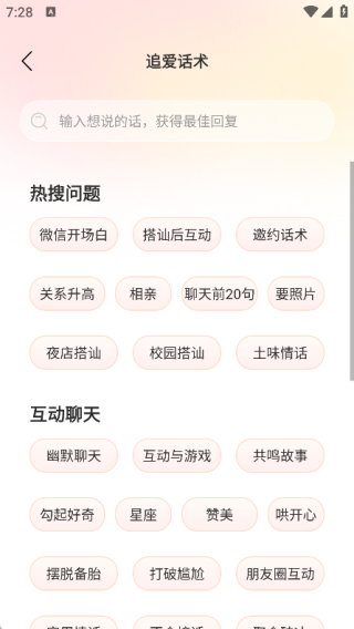 2、在追爱话术页面中输入想说的话,获得最佳回复,同时了解热搜问题和互动聊天信息;