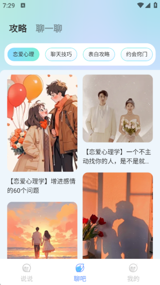 4、在聊吧页面中可以知晓恋爱心理、聊天技巧、表白攻略以及约会窍门等版块。
