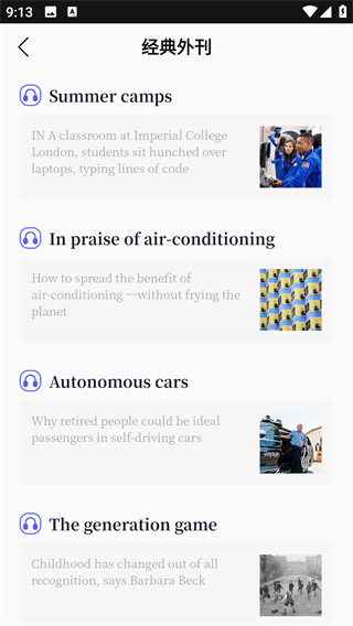 2、首页可以看到精选外刊、经典美文等各个功能入口;