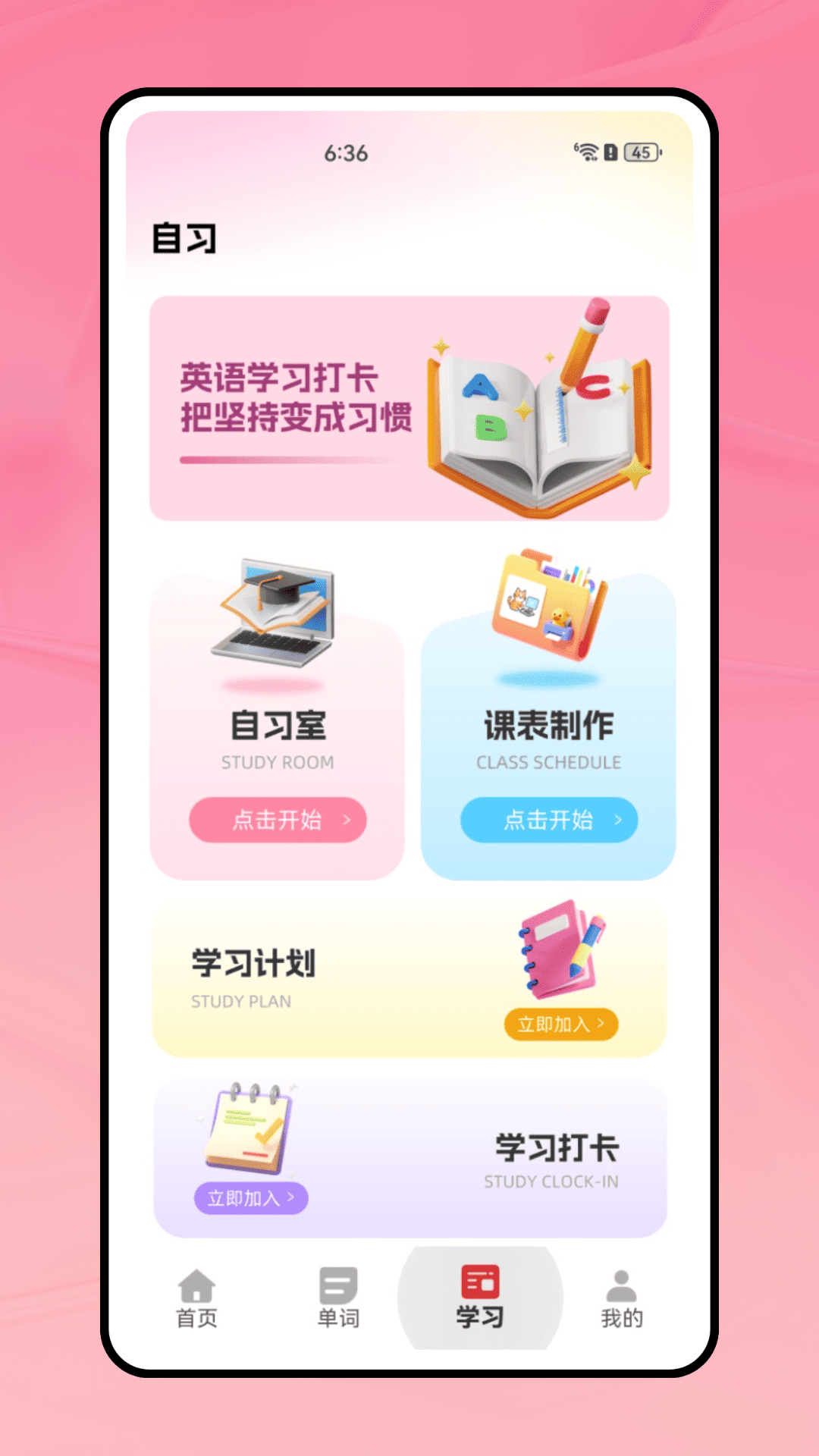 为用户提供了线上专属的自习室,方便用户选择自习时间来一键开启自己的自习模式,轻松自习。