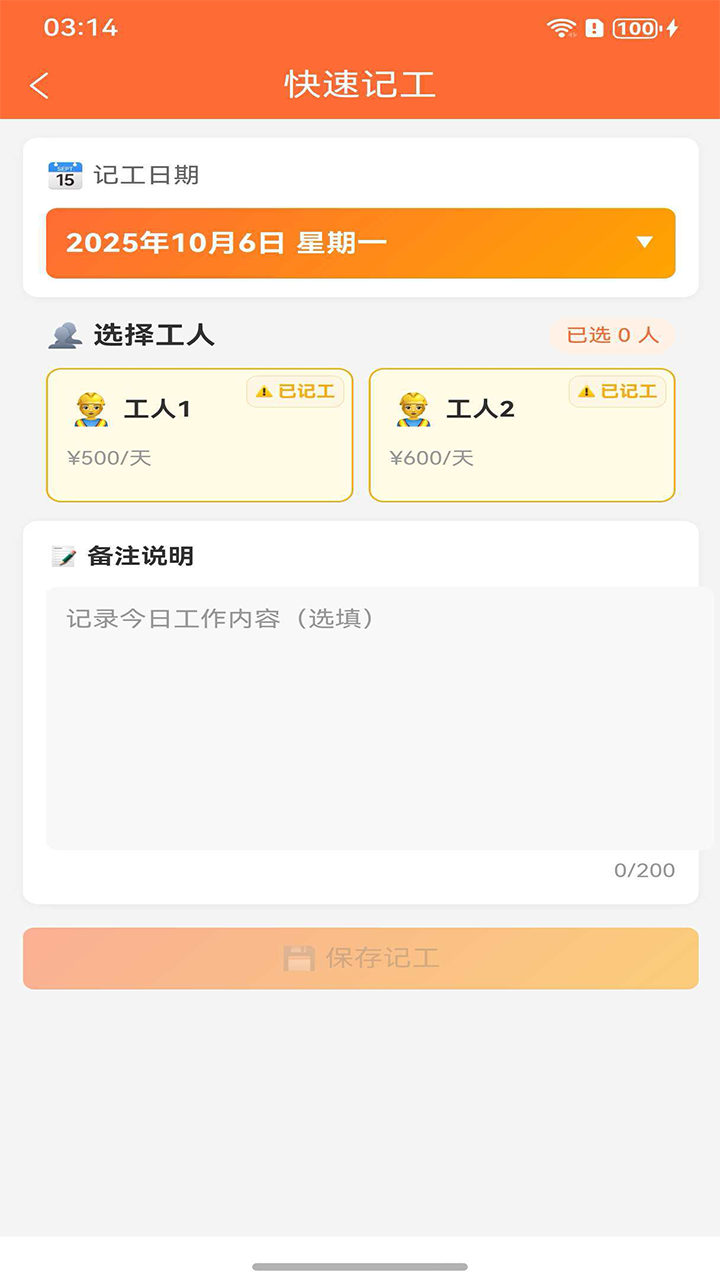 4、还可以添加工人记工,每次的记录都会安全存储的。