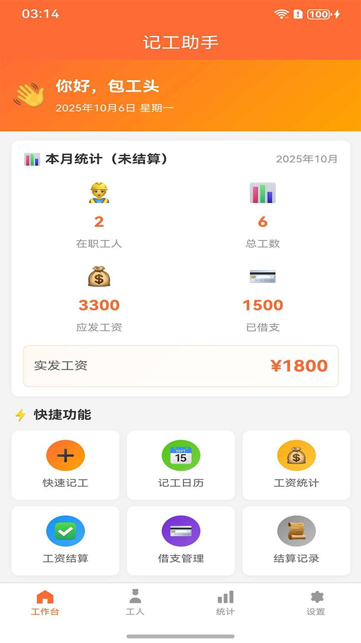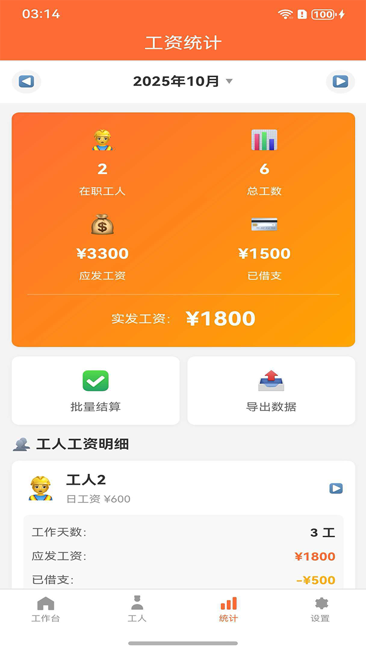 3、统计一定周期内的总工数、应发工资、已借支等,查看工人工资明细,支持批量结算与数据导出。