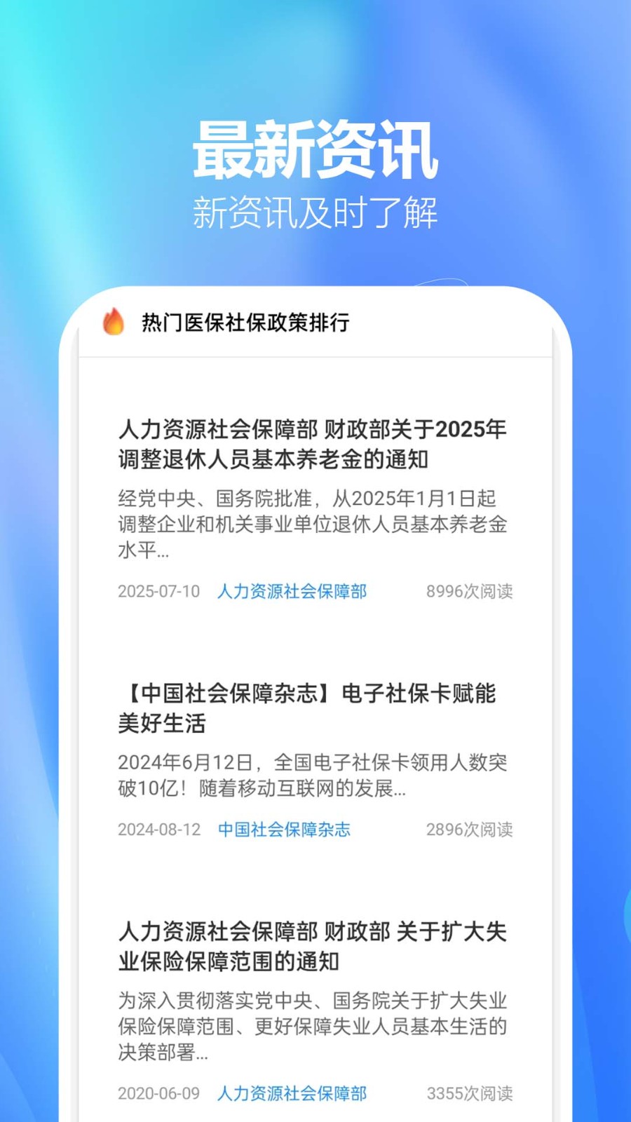 电子社保通是一款实用的社保服务软件。软件内提供多种便捷实用的功能,能够查看医保服务,支持医保报销估算、公积金计算等。软件内还能查询各种政策信息,上学政策、买车政策、养老政策等解读都应有尽有。并且每天还会为用户推送最新热门资讯!