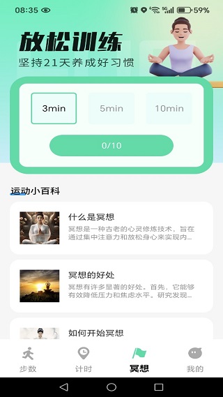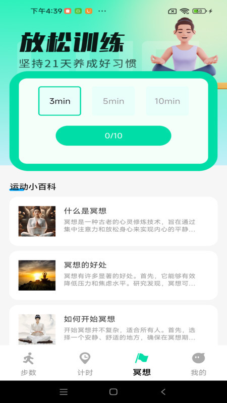 4、在冥想页面,大家自定义每日冥想时间,快速放松你的情绪。