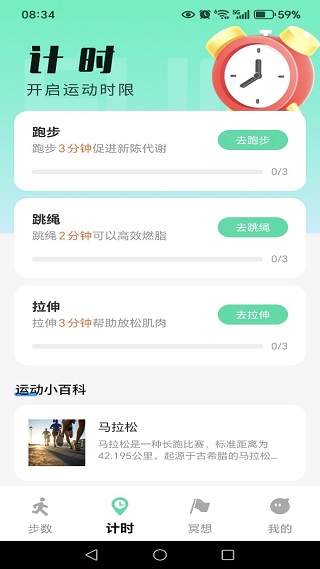 3、在计时页面,让大家更合理控制运动时间,还能掌握运动小百科内容。
