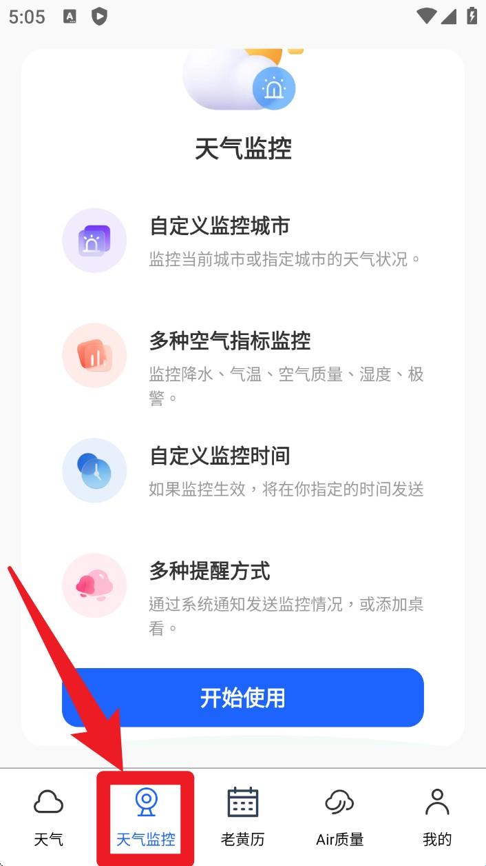 2、点击底部“天气监控”栏目,可设置指定城市、多项空气指标及自定义时间的天气提醒。