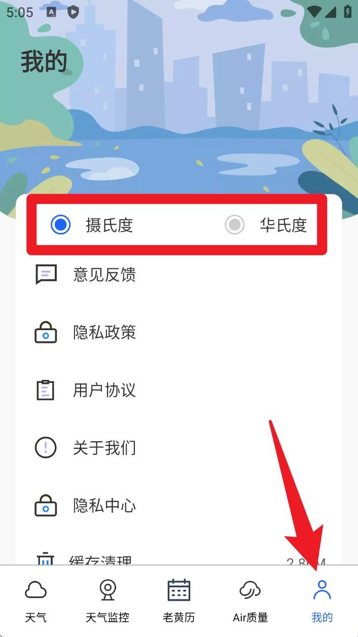 5、在“我的”页面中可切换摄氏度/华氏度,并查阅用户协议、隐私设置与清除缓存功能。