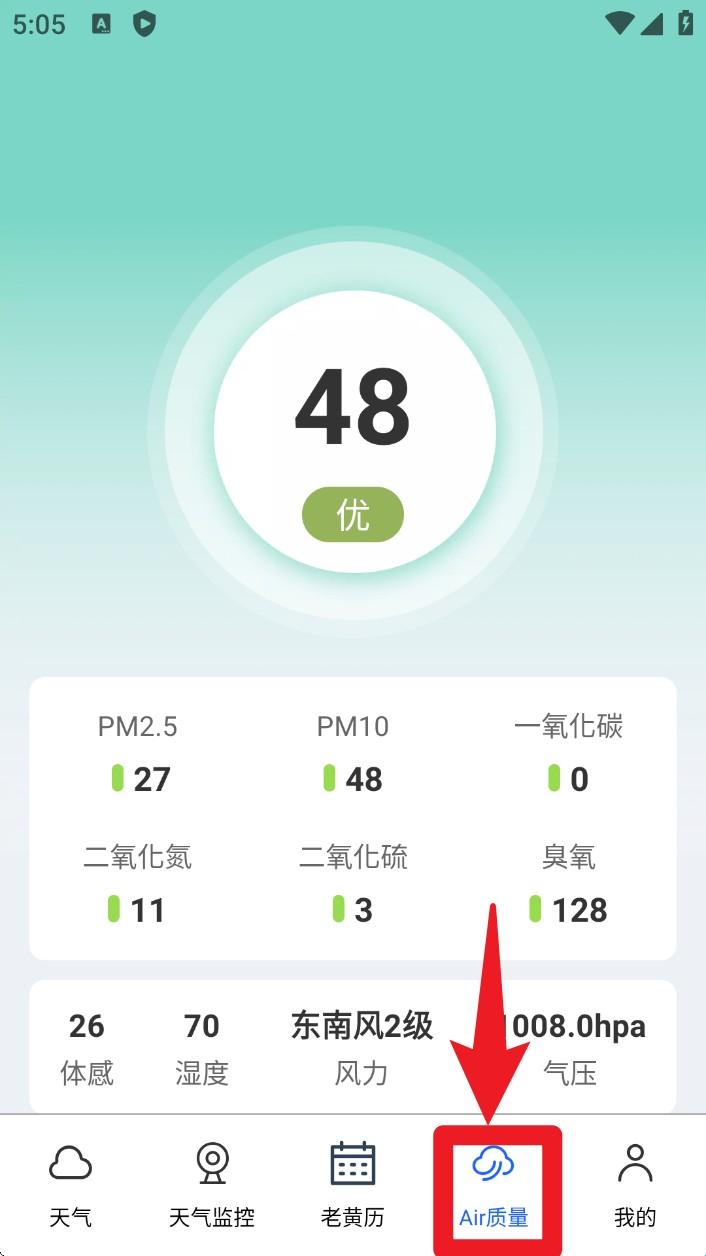 4、点选“Air质量”栏目,可查看PM2.5、PM10 等各项空气指标与空气优良等级的实时数据。