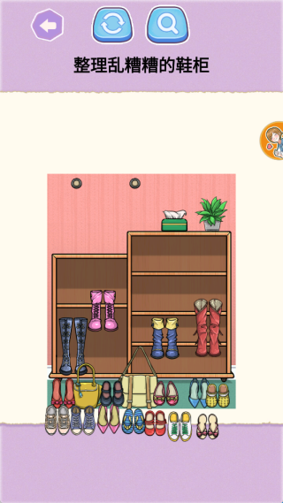 2、设有寻物关卡,在堆满物品的复杂场景中,依据提示整理鞋子。