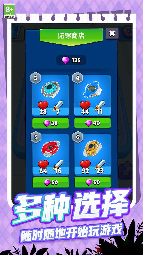 3、完成关卡后,优先用奖励解锁陀螺配件而非大量购买基础陀螺,优质配件能显著提升现有陀螺战力,性价比更高。