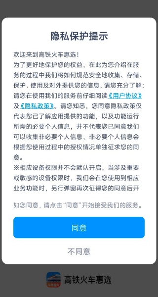 1、这款购票软件的隐私保护提示是需要大家一起来同意的;