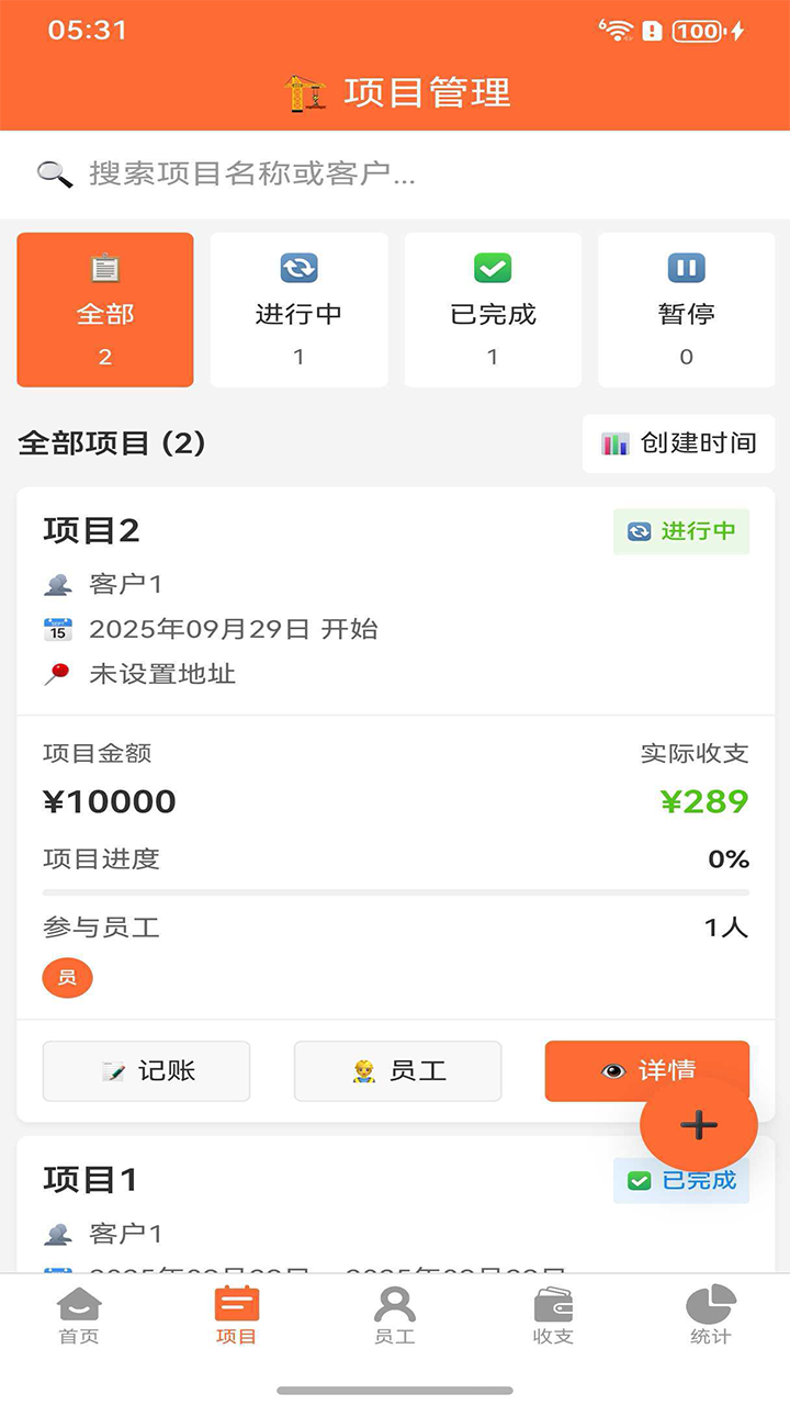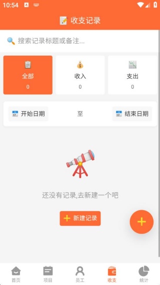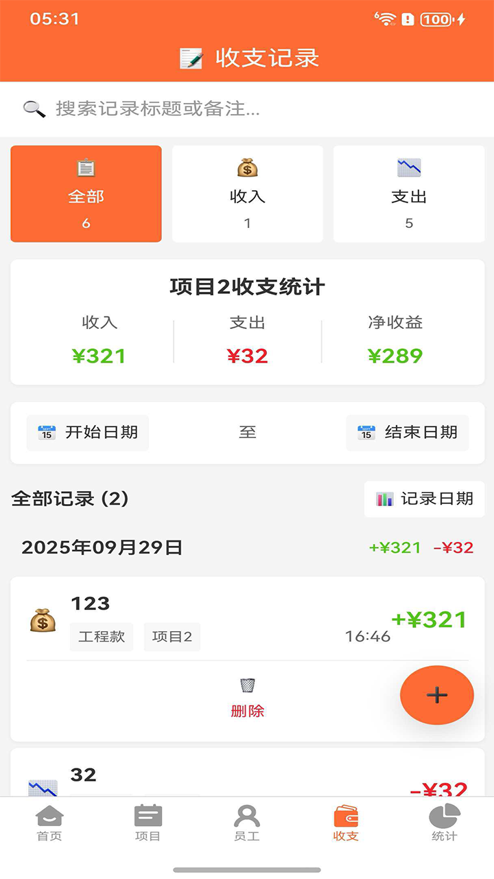 收支记录:快速记录工程收入和各项支出,支持按项目、日期、类型筛选