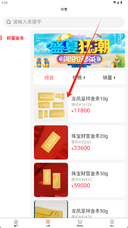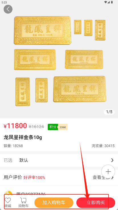 2、在商品列表页浏览或通过搜索框查找商品,或点击“龙凤呈祥金条”进入详情页。