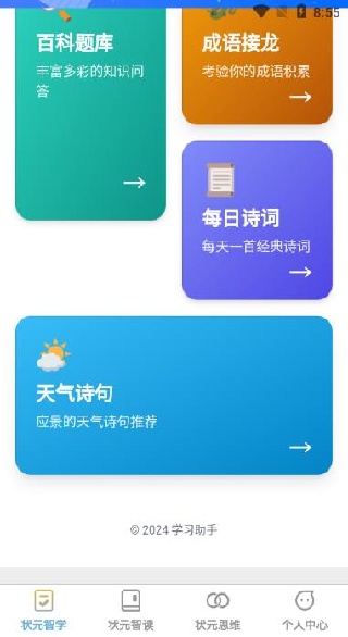 1、状元智学:状元智学是一个集成的学习中心,汇聚了各类学习资源和工具,用户可以在这里找到各种心仪的学习方式。通过系统化的学习计划与评估,帮助学生更好地掌握知识,提高学习效率。
