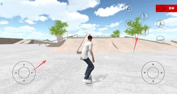 1、打开游戏进入,滑动左右两边的虚拟摇杆控制角色移动,点击右上角的按钮可以做出各种特技动作。