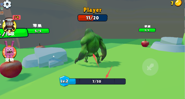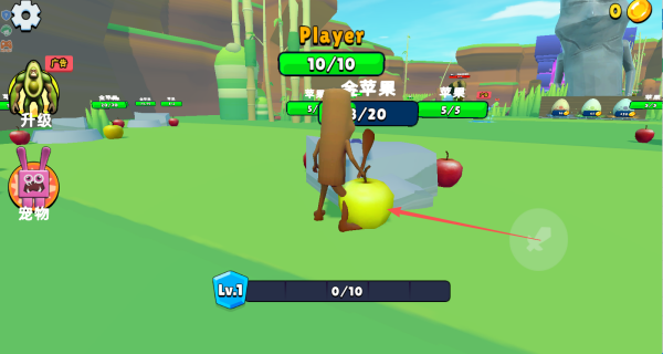 1、进入游戏后,点击并拖动屏幕,控制角色在地图中移动,击杀苹果或其他怪物来升级。