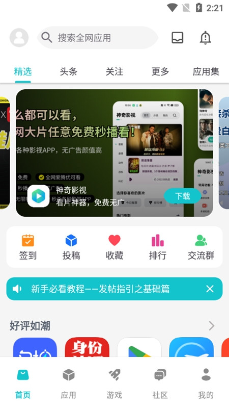 神奇应用1.8.9版本可以为用户提供海量的应用资源,不管是影视、小说、漫画还是学习工具、玩机娱乐应用等,都能满足用户的需求,并且所有的资源都是蓝奏云高速下载,帮助用户快速获取所需的资源,同时软件还提供了交流社区栏目,让用户自由分享使用心得。