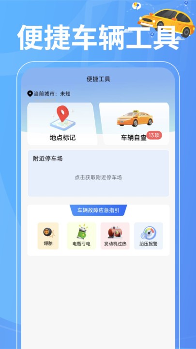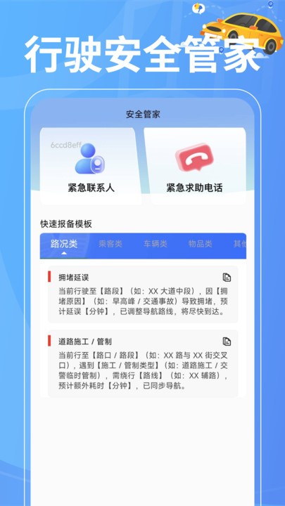 2、同时提供车辆自查、故障应急指引等车辆工具,以及紧急联系人、快速报备等安全服务,界面简约易操作,为出租车运营带来便利。