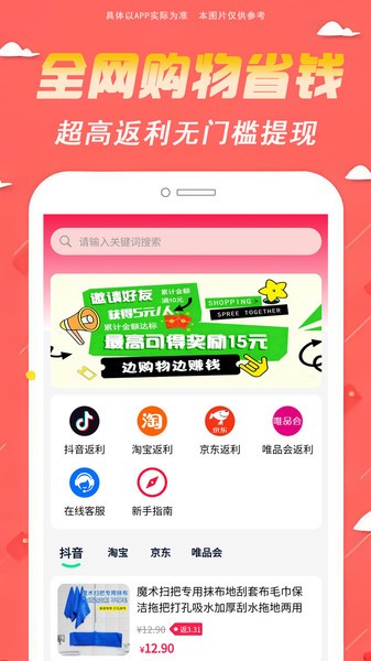 云省赚是一款购物返佣软件。软件内提供海量的优惠精选商品,每样都是优质大牌,商品质量有保障。软件内支持一键搜索全网各大购物平台隐藏优惠券,领先取在下单更省钱。并且在软件内购物可享高额返利,支持微信、支付宝无门槛提现,没有套路快来下载试试吧!