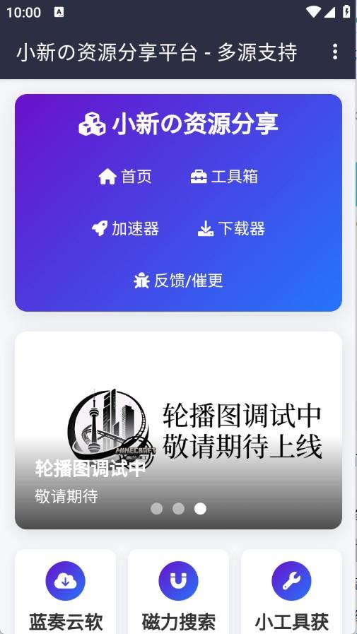 1、用户首先下载小新的资源分享app,进入到首页之后可以看到很多的资源类型,不管是工具箱、磁力搜索还是软件库等都有。