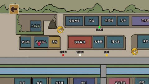 6、进入地图界面,可以看到当前所在的位置,和游戏中各个场景和摊子的地址,