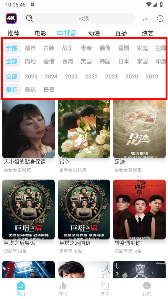 2、如图,根据题材、年份、热门等筛选所需下载的剧集。