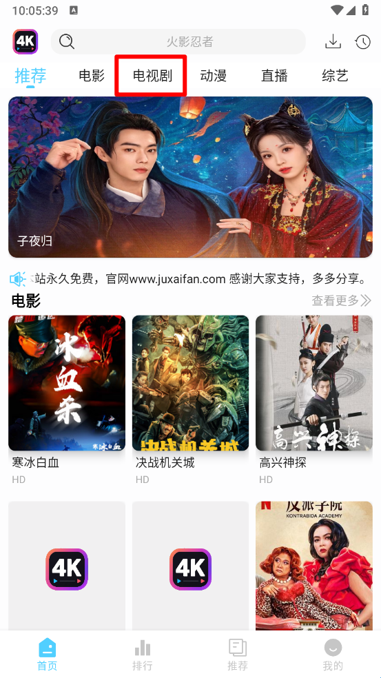 1、打开4K剧下饭软件,在主页点击"电视剧"。