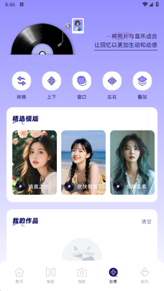 4、在影集页面中有转换、上下、窗口、左右以及叠加等功能,还精选了不同的模板。
