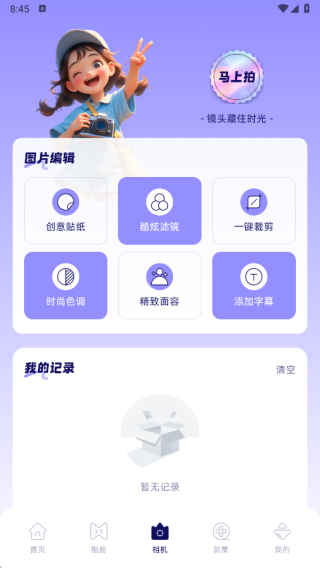 3、在相机页面中有创意贴纸、酷炫滤镜、一键裁剪、时尚色调、精致面容以及添加字幕等操作;
