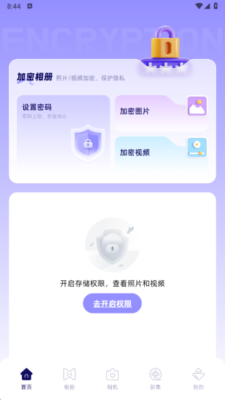 1、在首页中提供了加密相机的功能,可以进行设置密码、加密图片、加密视频等操作;