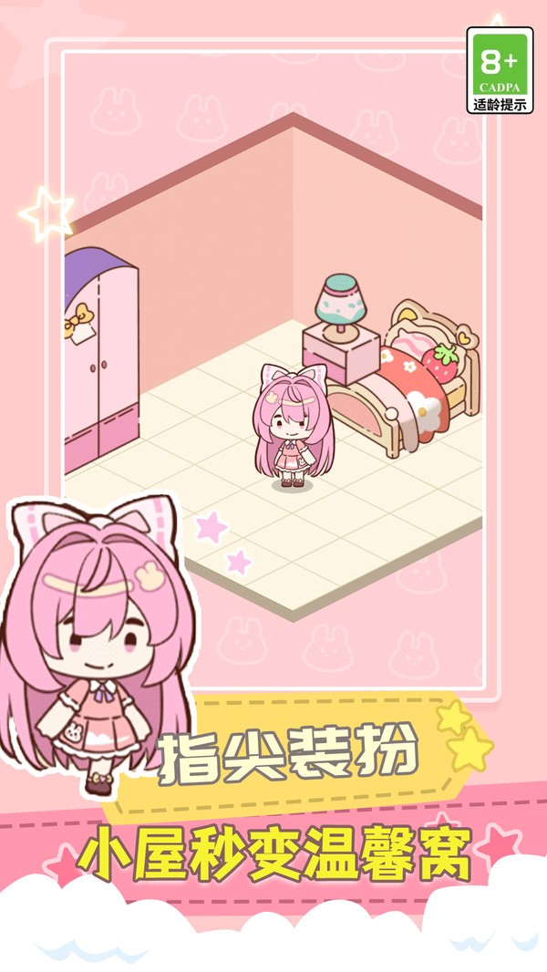 1、游戏的主界面是一个精心设计的小屋,玩家可以自由选择不同的房间进行装扮;