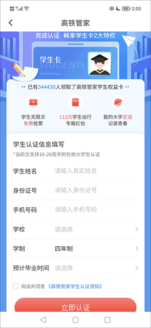 3、最后,在认证学生信息当中按照要求填写好学生姓名、身份证号、手机号码、学校、学制、预计毕业时间后,勾上“阅读并同意《高铁管家认证须知》”并且找到并点击“立即认证”按键。