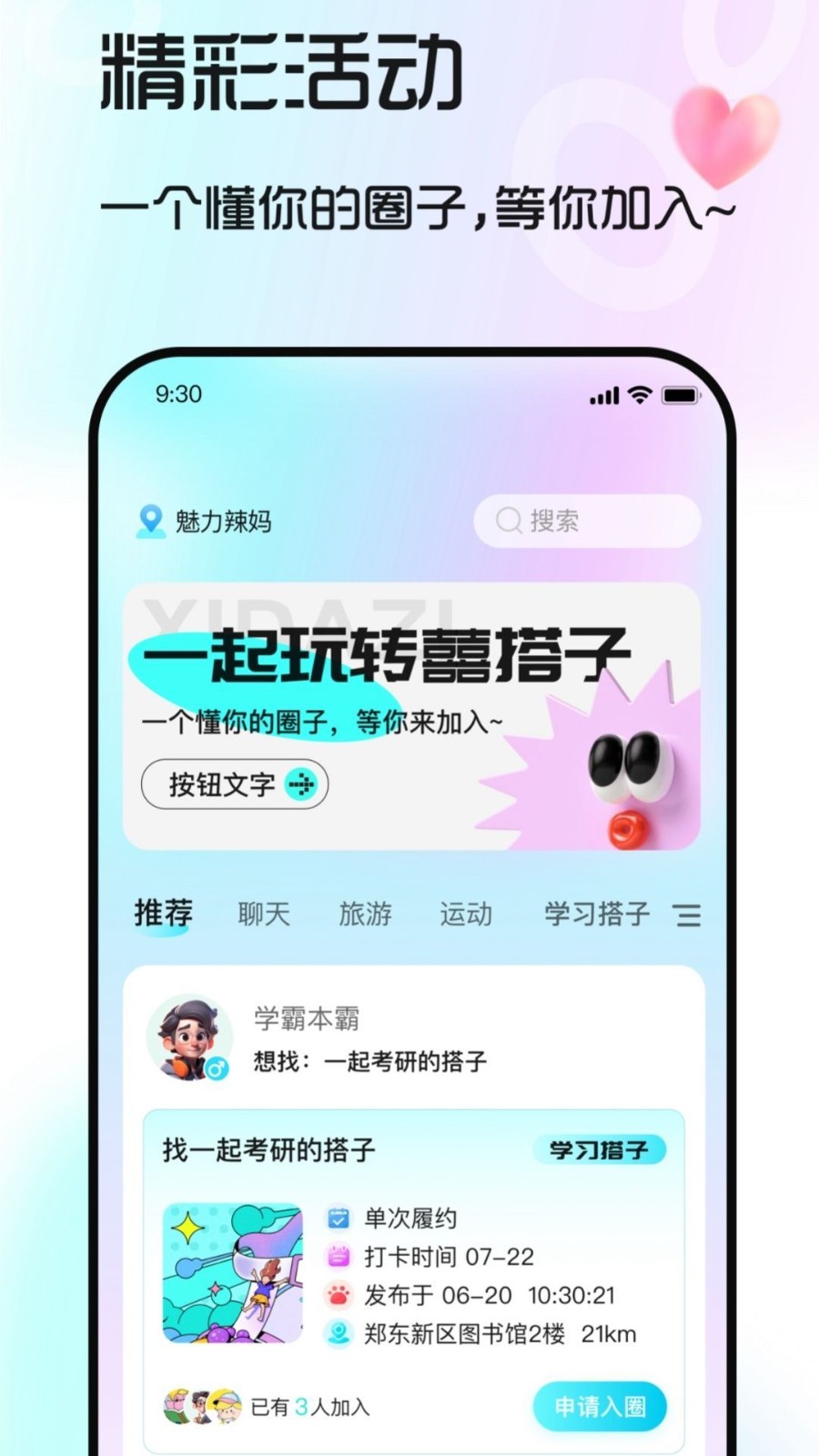 您的结伴神器。专为寻找户外、游戏、学习、吃饭、交友等搭子设计。