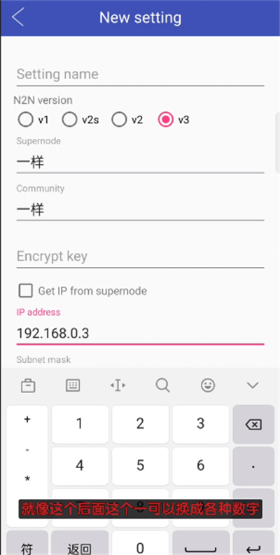 2、N2N version需要选择V3,配置名称可以随便取,接下来需要分别填写主服务器、房间名、密码和虚拟IP地址;